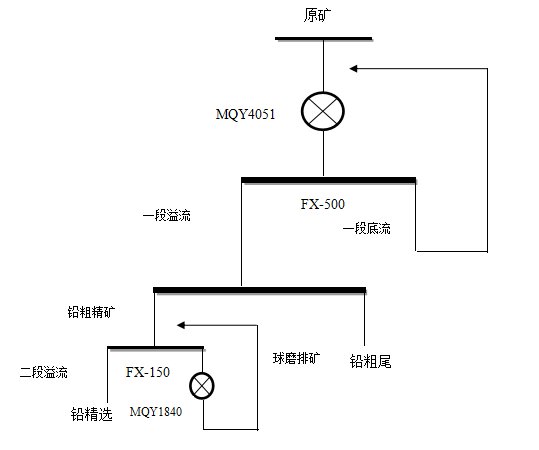 鉛粗浮選精礦自流到再磨渣漿泵池,礦漿濃度40% 左右,經(jīng)由渣漿泵在一定的壓力(0.08—0.16MPa)和下?lián)P送至再磨旋流器(Ф150㎜)進(jìn)行分級,合格粒級產(chǎn)品(-400目90%)從溢流管排出并自流到鉛精選攪拌槽,不合格粒級產(chǎn)品經(jīng)沉沙嘴排出,自流到再磨球磨機(jī)(Ф1800×4000㎜)進(jìn)行再磨,磨礦濃度70%左右,經(jīng)磨機(jī)內(nèi)鋼球沖擊研磨后自流到再磨渣漿泵池內(nèi),與浮選鉛粗精礦混合形成閉路循環(huán)。